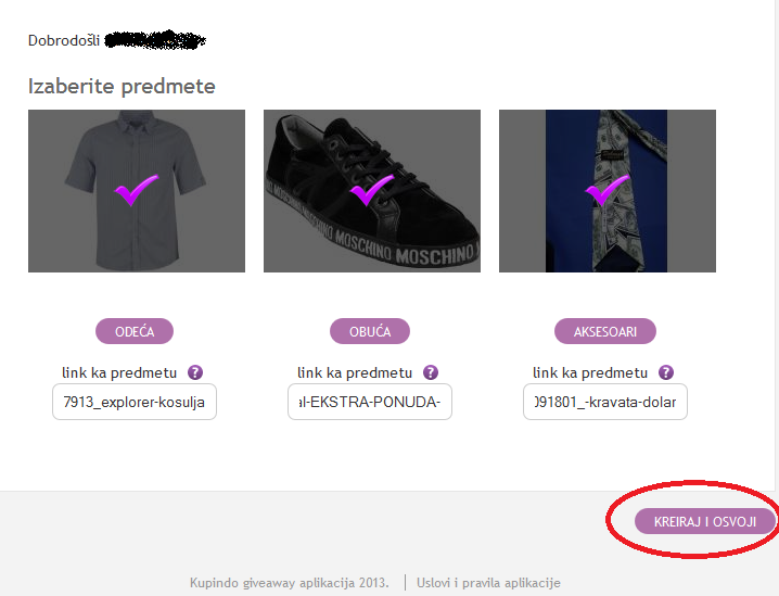 Nakon što ste prihvatili pravila, otvara vam se prozor: “Moja kombinacija” gde je potrebno da unesete svoje korisničko ime sa Kupinda i šifru. Klikom na “Pošalji”, sistem vas loguje sa vašim korisničkim imenom. Potom možete da kreirate svoju kombinaciju, tako što u odgovarajuće polje unosite link ka predmetu sa Kupinda i to u sve tri kategorije – Odeća, Obuća i Aksesoari.