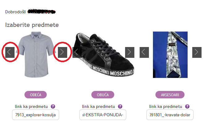 Kada odaberete predmete, možete da birate koja će se slika prikazivati u kombinaciji (naravno, ako predmet ima više ponuđenih slika), i to klikom na strelice sa strane.