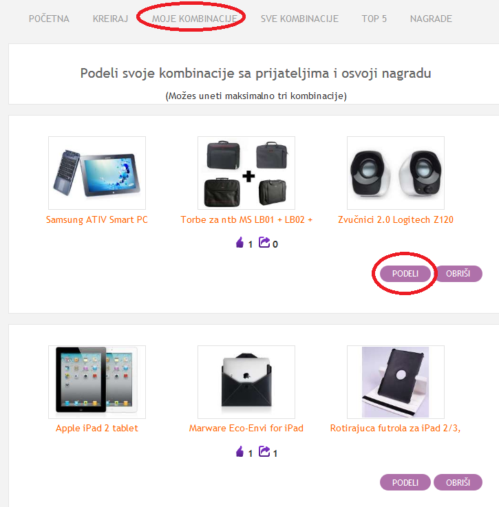 U delu “Moje kombinacije” u svakom trenutku možete da vidite vaše kombinacije. Možete uneti maksimalno tri kombinacije, a svaku od njih možete obrisati i napraviti neku novu. Ne zaboravite da kliknete na dugme “Podeli” kako bi svi vaši Fejsbuk prijatelji videli vašu kombinaciju i glasali za nju. Što više glasova — > veća šansa da osvojite vredne nagrade.