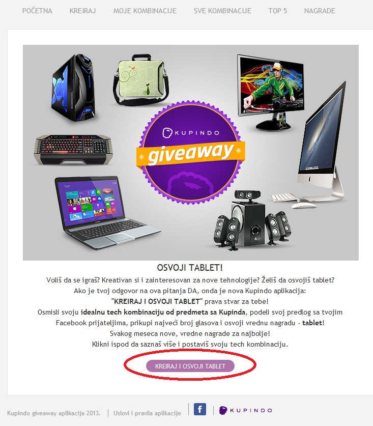 Na Kupindo Fejsbuk stranici trenutno je u toku Kupindo giveaway aplikacija “Kreiraj i osvoji tablet“. Osmislite svoju idealnu tech kombinaciju od predmeta sa Kupinda, podelite svoj predlog sa vašim Fejsbuk prijateljima, prikupite najveći broj glasova i osvojite vrednu nagradu – tablet! Igra se završava u ponedeljak 10. juna u 12 h. Pobednička kombinacija se određuje na osnovu broja “glasova” koje joj dodeljuju drugi korisnici Fejsbuka. Nagrade se dodeljuju za dva korisnika koja imaju najviše glasova.