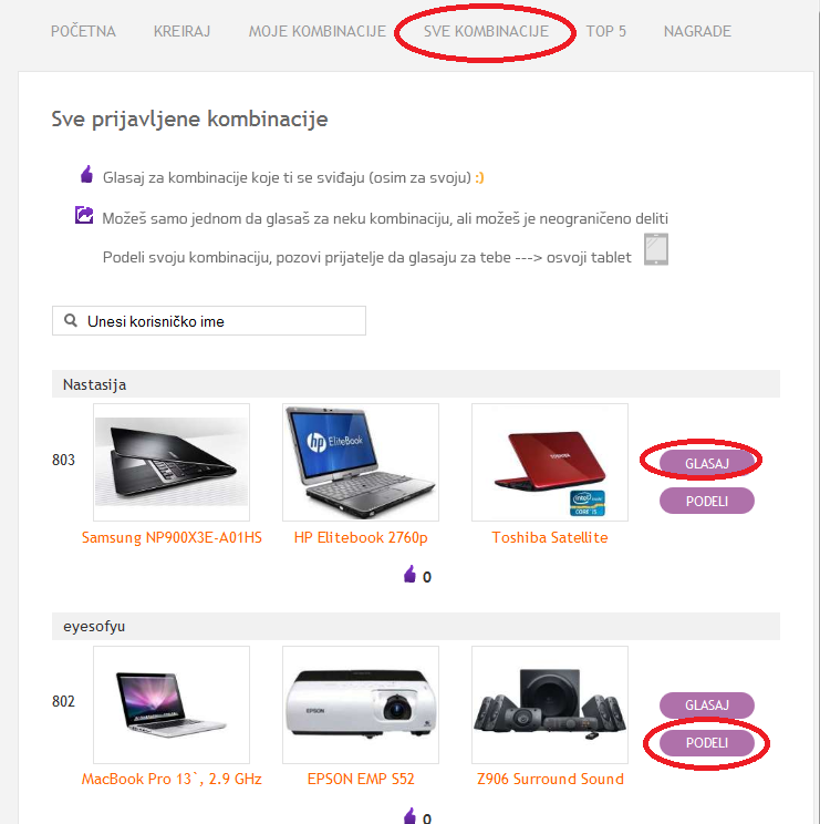 U delu “Sve kombinacije” možete pregledati sve prijavljene kombinacije i glasati za one koje vam se dopadaju (naravno, ne možete glasati za svoju). Za svaku kombinaciju možete glasati samo jednom, ali je možete deliti neograničen broj puta.