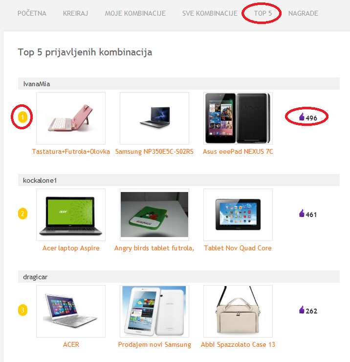 U delu “Top 5” se vidi 5 najbolje rangiranih kombinacija, odnosno 5 kombinacija koje trenutno imaju najviše glasova. Pored svake kombinacije možete videti koliko glasova trenutno ima. Ova tabela se stalno menja, a pobednik će biti onaj koji u trenutku završetka aplikacije bude imao najviše glasova.