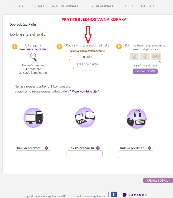 Dakle, prvo pronađite interesantne predmete na Kupindu (iz kategorije Računari i oprema), kopirajte link ka tom predmetu u odgovarajuće polje, potvrdite sliku klikom na nju i kada ste potpuno zadovoljni kombinacijom, kliknite na dugme “Kreiraj i osvoji tablet“. Slike računarskih komponenti u ikonicama su samo ilustarcija, možete da iskoristite bilo koji predmet sa Kupinda iz kategorije Računari i oprema.