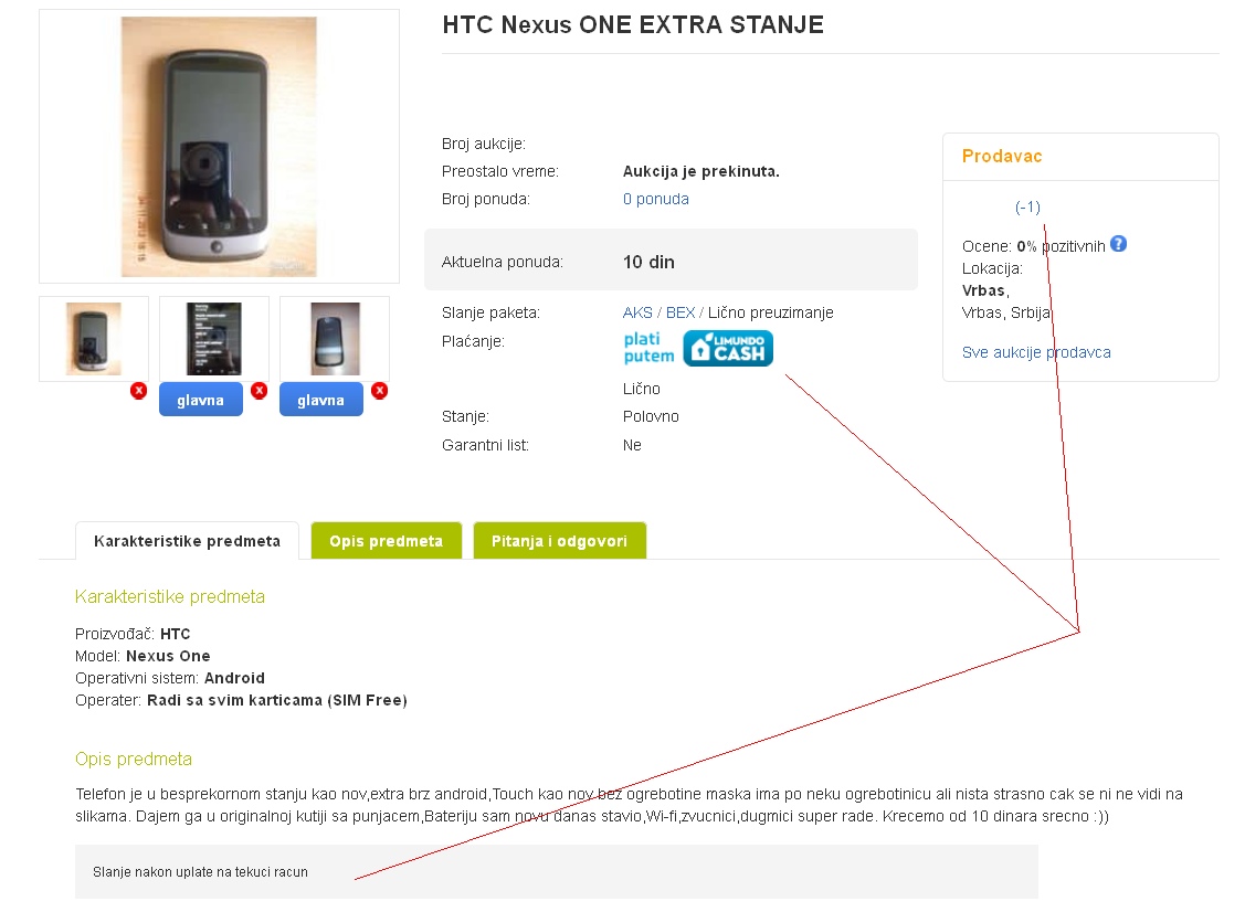 Prodavac čiji je zbir ocena -1, prilikom pokretanja aukcije ponudio je dve opcije plaćanja: Limundo Cash i Lično preuzimanje. Međutim, u uslovima prodaje navodi da je slanje moguće tek posle uplate na tekući račun.