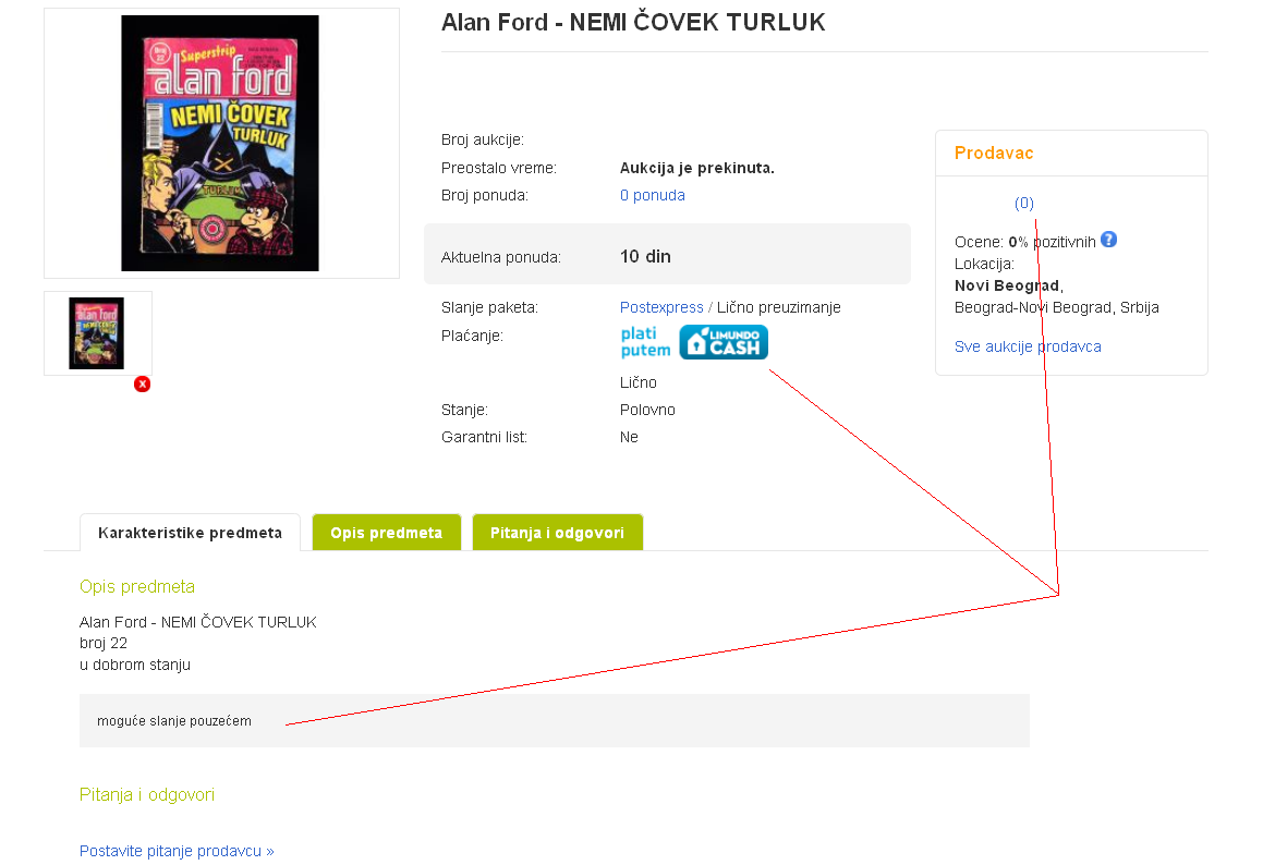 Prodavac koji ima zbir ocena 0, prilikom pokretanja aukcije ponudio je dve opcije plaćanja: Postexpress i Lično preuzimanje. Međutim, u uslovima prodaje navodi da je moguće plaćanje pouzećem.